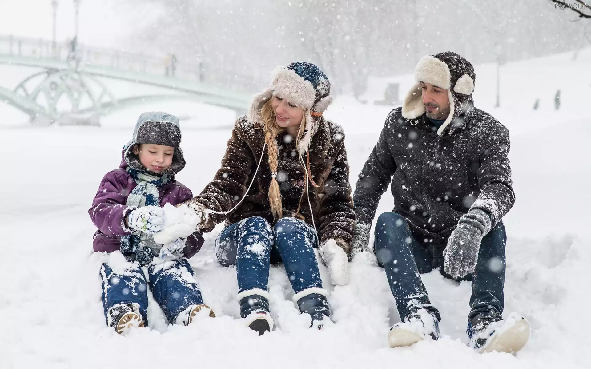 Zima, Radość, Zabawa, Śnieg, Rodzina, Mama, Śnieżki, Dziecko, Tata, Most - faceci.biz